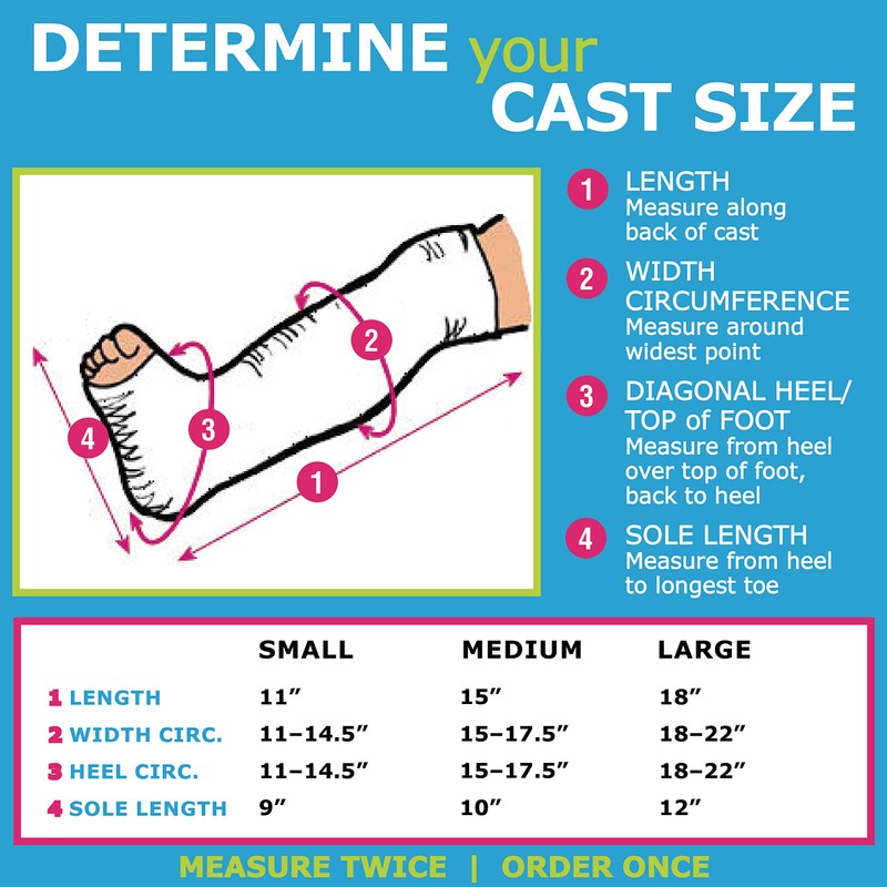 - MEASURE TWICE and ORDER ONCE to guarantee the right size cover and prevent the hassle of exchanges or returns. Sizing is determined by careful measurement of the cast/bandaging/brace, not the age, body frame or shoe size of the user. If sizing falls outside of listed range, or you have pins, excessive casting, or any other questions, please contact seller.