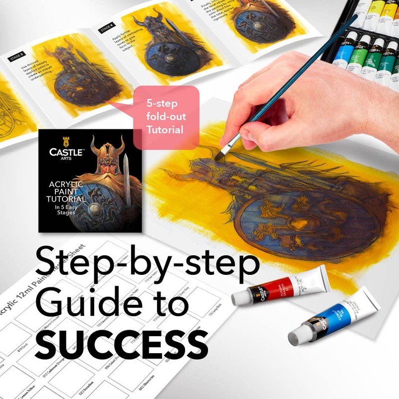 To help you enhance your skills, this set includes a unique fold-out tutorial. It guides you through five easy-to-follow steps to recreate the stunning Viking box lid illustration, allowing you to explore the world of acrylics and expand your artistic repertoire.