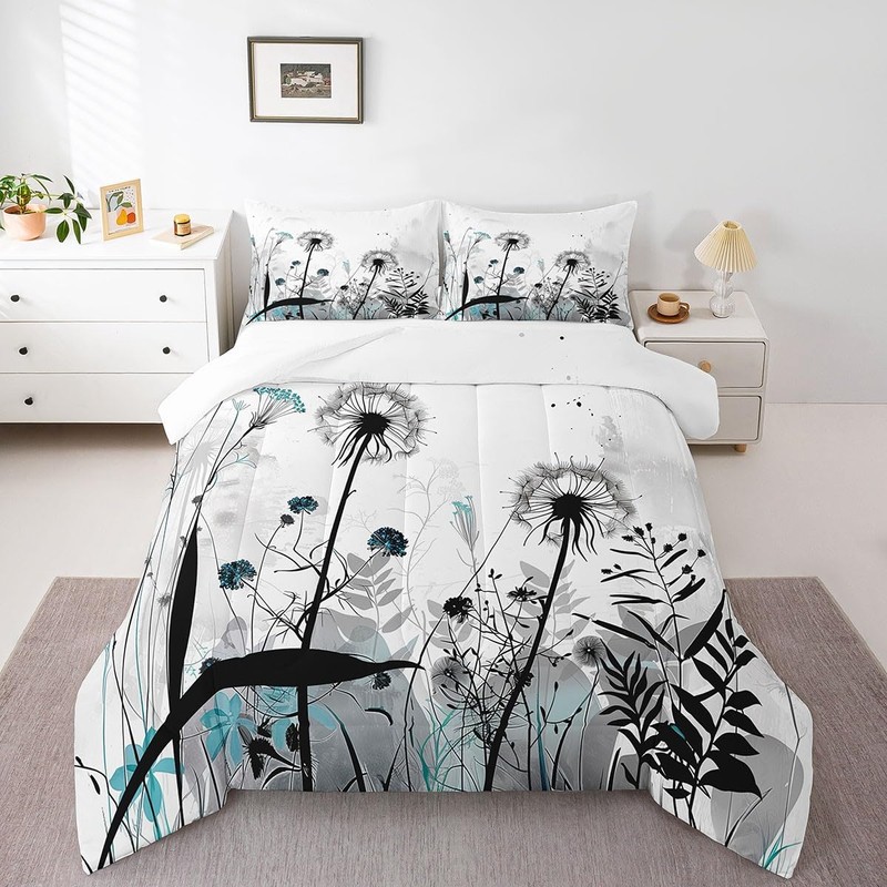 Castle Fairy Dandelion 3 Pcs Queen Size Comforter Set,Dragonfly Flowers Down Alternative Adults Bedroom Decor,Rustic Farm Plants Ultra Soft Microfiber Inner Fill 3Pcs Bedding