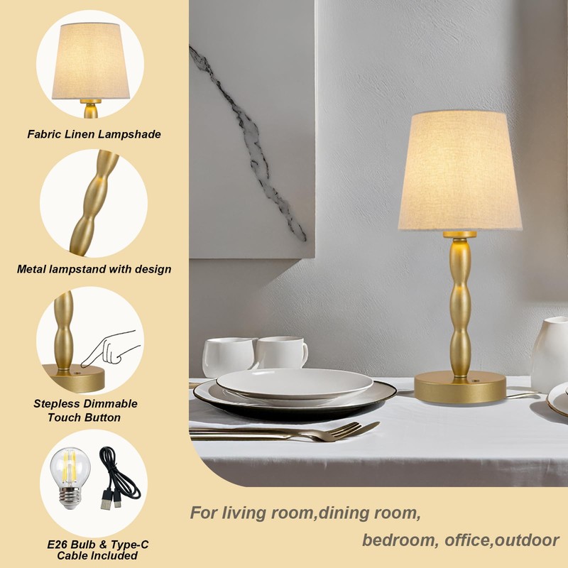 - 【Thoughtful Gift & Versatile Use】This portable touch lamp is an ideal gift for families or friends. It comes with an E26 dimmable bulb in the package, making it easy to install right out of the box.It serves as a good helper for various occasions, such as romantic dinners, family parties, and outdoor lighting. Its cordless function allows for convenient use anywhere.