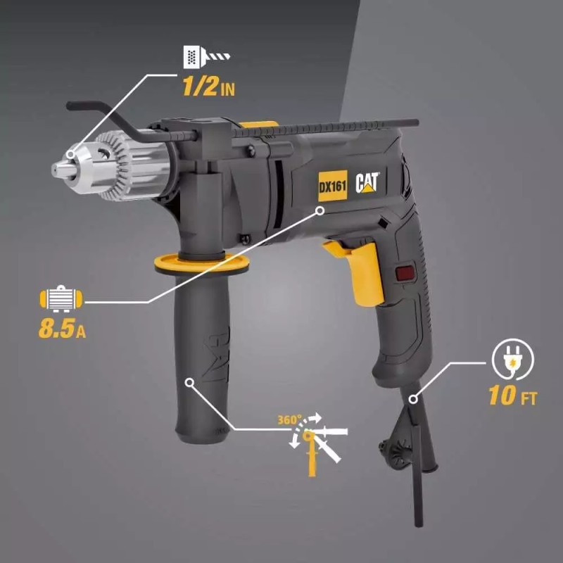 The Cat DX161U 8.5-Amp 1/2 in. Corded Hammer Drill was born from superior engineering and next-generation technology. The result is an electric hammer drill that boasts outstanding performance that lives up to the legendary Cat reputation for quality and durability. Made specifically to be the professional user’s hammer drill, with the power and functionality to handle a wide range of hammer drill applications, and the rugged construction to take on tougher jobs. The Cat Corded Hammer Drill was built with a powerful 8.5-Amp motor that delivers 3,000 RPM and 48,000 BPM for sustained performance in any situation. The 1/2 in. heavy-duty metal keyed chuck provides impressive and reliable bit retention. The lightweight aluminum gearbox delivers ultimate durability for heavy-duty work. And the lock-on switch is handy for continuous operation. Innovative ergonomic design makes this hammer drill easier on the user, too, even for extended periods during the toughest applications. The rubber overmold grip provides comfort and control and the 10-ft. trade-length power cord allows for freedom of movement in the workspace. Cat Tools are made for the pros, with advanced features and capabilities that add up to higher productivity with less operator fatigue and reduced downtime. Let’s Do The Work. [LET’S DO THE WORK] Cat Corded Power Tools are ready to get to work with tools designed to get the job done [POWERFUL 8.5A MOTOR] Delivers 3,000 RPM with 48,000 BPM for heavy-duty applications [ALUMINUM GEAR BOX] Delivers the ultimate durability for the toughest applications