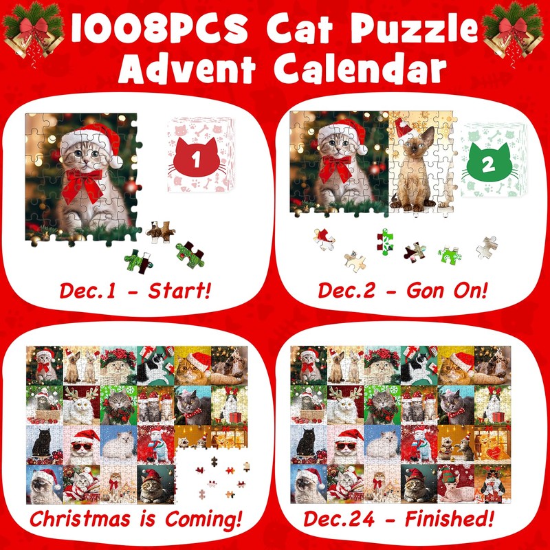 - Cat Puzzle Advent Calendar 2024:Experience the magic of Christmas with our Cat Advent Calendar 2024, featuring 24 numbered boxes, each revealing a unique cat-themed jigsaw puzzle. Starting on December 1st, open a new box daily to unveil a festive feline scene, and by Christmas Eve, complete the entire 1008-piece puzzle for a delightful holiday mural measuring 50 x 70 inches—perfect for adding a cozy, cat-loving touch to your holiday decor!
