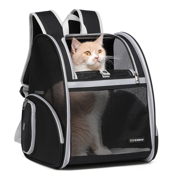 Cat Backpack Carrier Pet Backpack Carrier for Small Dogs and Medium Cat Puppy Kitten Bunny up to 15lbs, Cat Carrying Backpack Collapsible with Fully Ventilated Mesh with Safety Leash (Black) | FERMAO