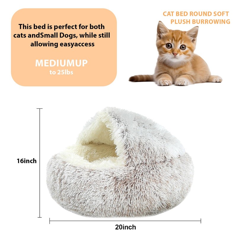 Cat Bed Round Soft Plush Burrowing Cave Hooded Cat Bed Donut for Dogs & Cats, Faux Fur Cuddler Round Comfortable Self Warming pet Bed