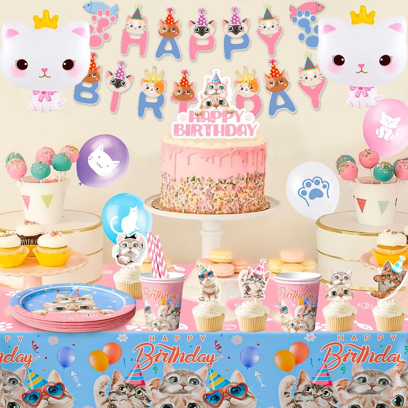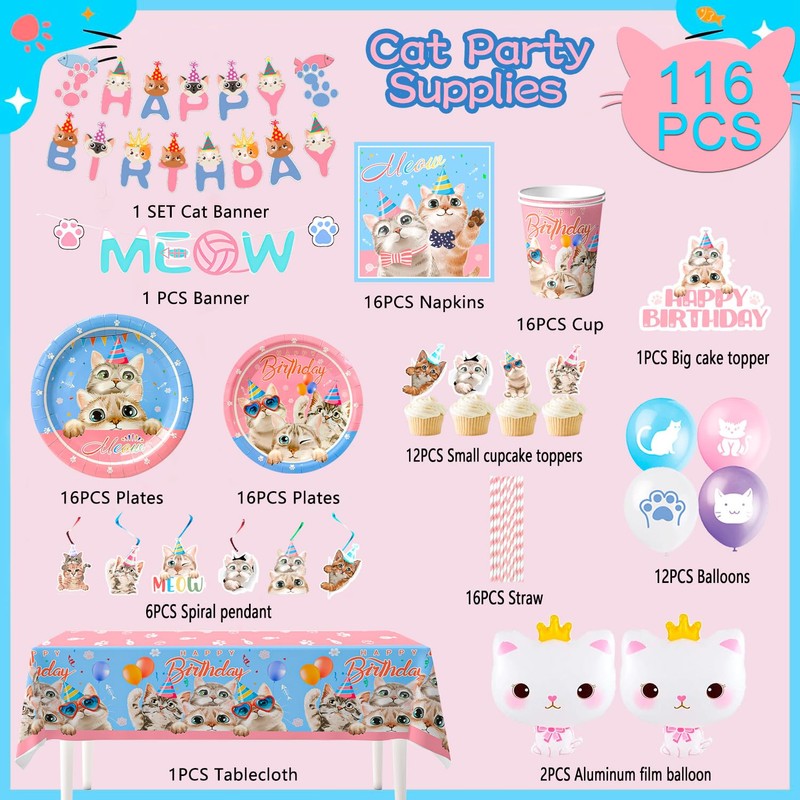 - Cat Party Supplies Package: This cat birthday party supplies&cat birthday party decorations set include 2 cat birthday banners, 1 cat party tablecloth, 16 7'' cat paper plates, 16 9'' cat birthday plates, 16 cat theme party cups, 16 cat party napkins, 13 cat cake decorations,2 cat foil balloons,12 cat balloons ect cat birthday decorations for girls, serving 16 guests.