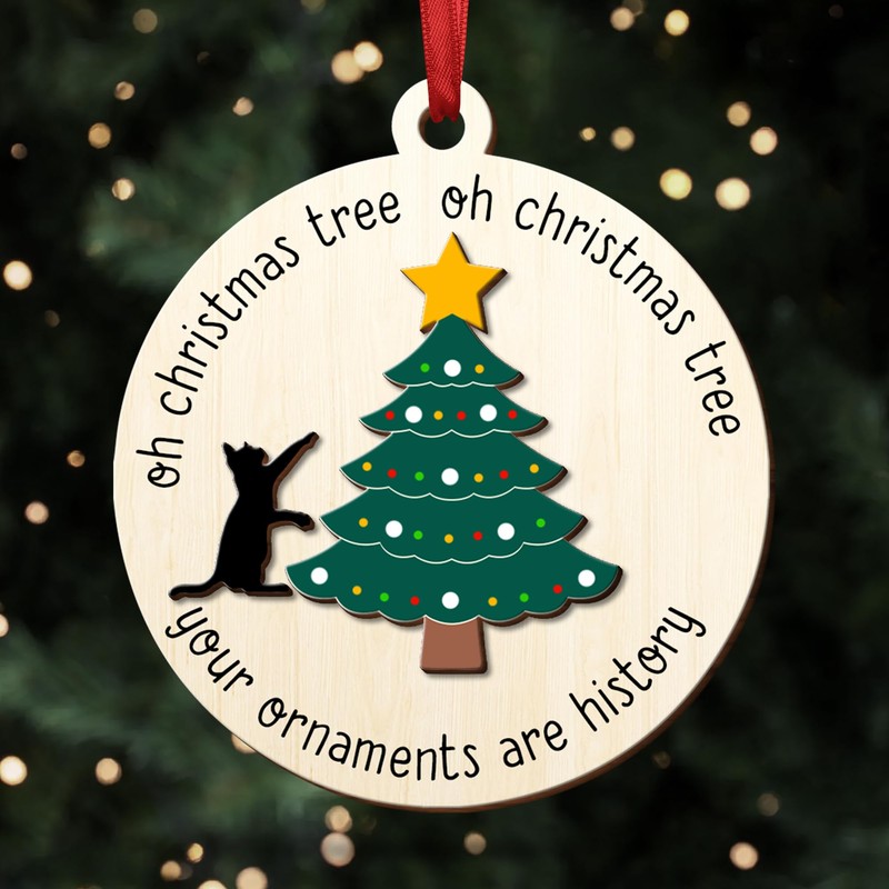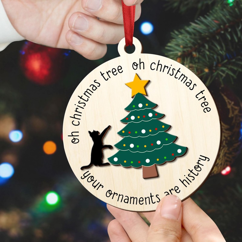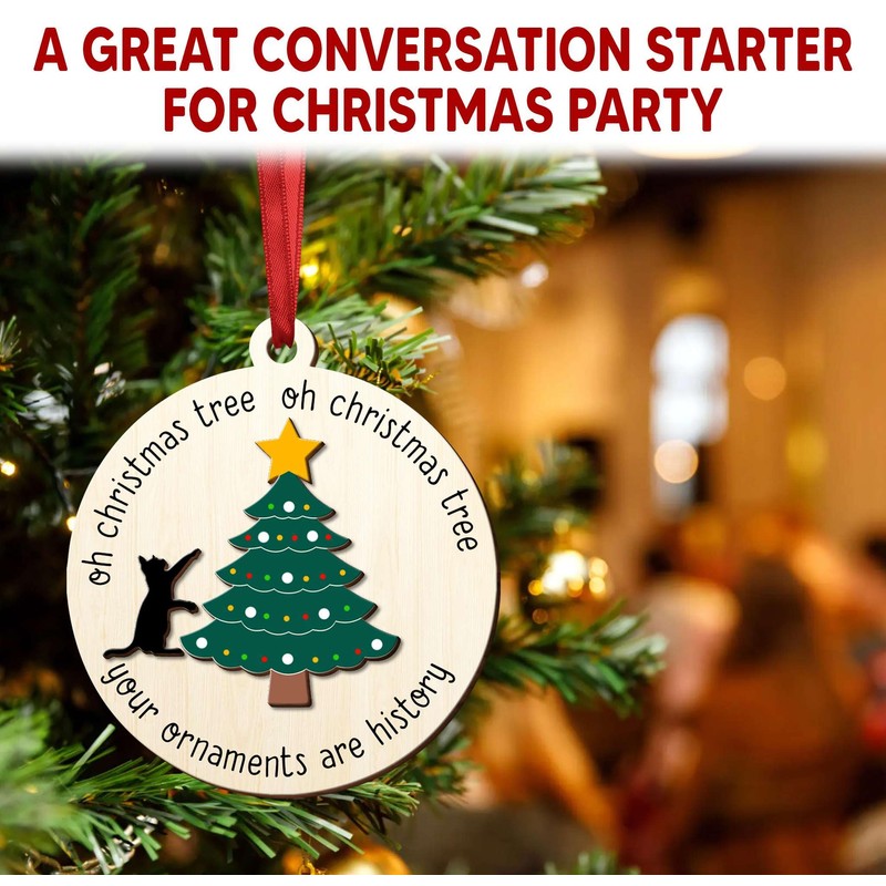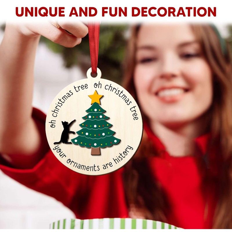- - FUNNY CAT CHRISTMAS ORNAMENT 2024 – Celebrate the antics of your playful feline with this hilarious cat-themed ornament. Featuring the phrase "Oh Christmas Tree, Your Ornaments Are History," it’s a relatable and charming addition to your holiday décor.