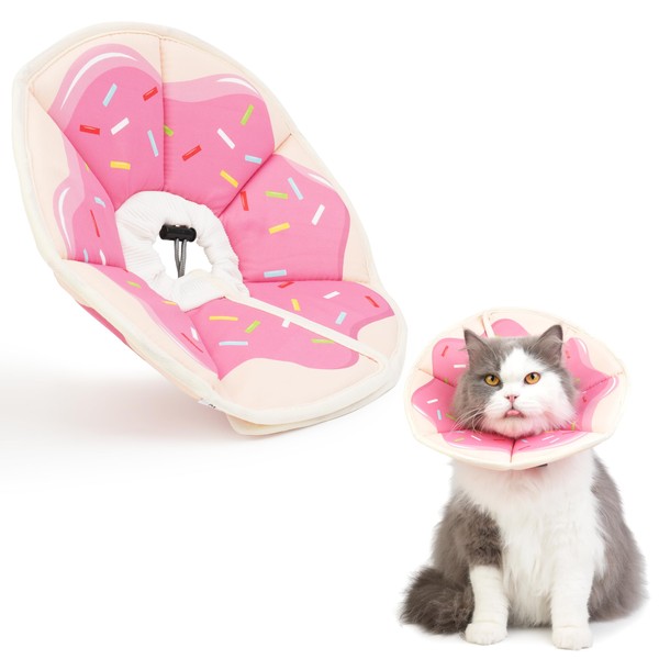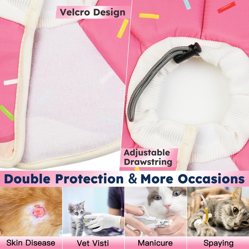 • EFFECTIVE PROTECTION: This cat cone is a perfect cone for cats after surgery. Pets often bite and lick their injured area or surgical site. We increased the diameter of the Cat cone collar soft to prevent this, even for lower limb wounds. With this collar on, the unique and cute donut shape makes it like a pet ornament instead of a cat surgery collar. Imagine your cat wearing it and looks like a donut, you both will be in a good mood all day