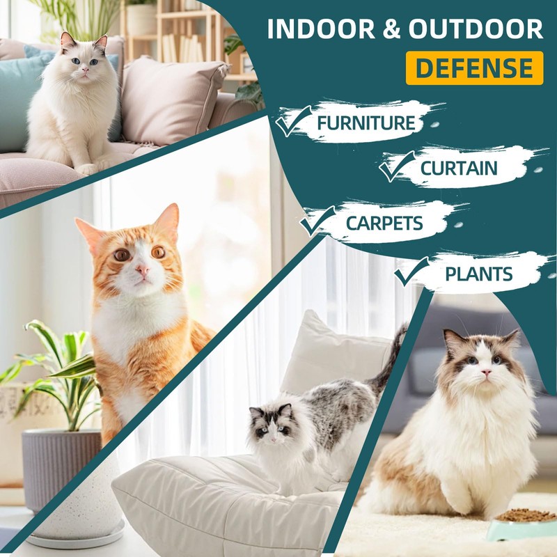 - Indoor And Outdoor Protection : Use this versatile spray indoors on sofas, rugs, and curtains, or outdoors to protect plants and garden areas from curious cats and kittens.