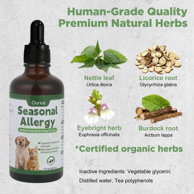 - Seasonal Allergy Care Formula: It combines herbal essence such as Nettle Leaf, Licorice Root, Eyebright Herb, Burdock Root to help relieve skin redness, dryness, itching and other problems caused by cat dog allergies and provide seasonal allergy relief for cats dogs. Continuous use can improve scratching and hair loss caused by allergies, repair the skin barrier and improve overall skin health. This also helps regulate the immune system, soothe allergic reactions, and reduce discomfort.