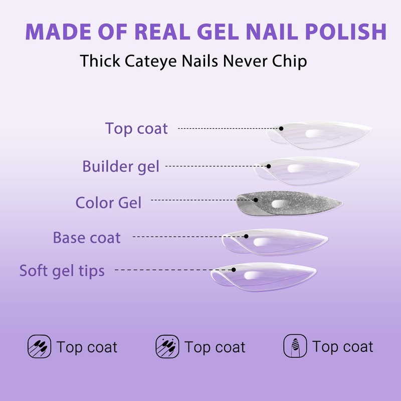- Save Time & Money: With acrylic press on nails cat eye you can enjoy salon-level results in the comfort of your own home.You'll save both time and money by opting for petite press on nails set.Only 5 Minutes,you could get the same glitter effect by yourself instead of spending an hour and paying for the expensive manicure service in the nail salon