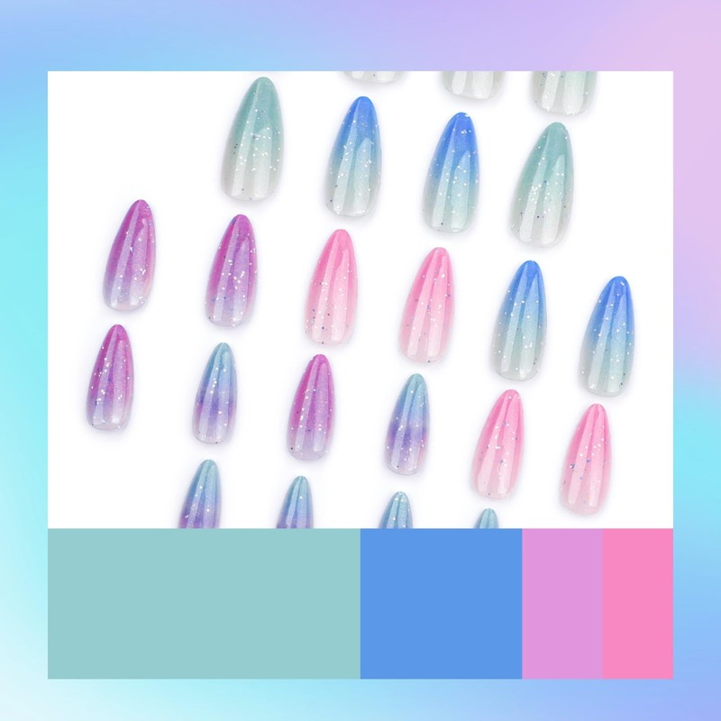 Cat Eye Press on Nails Almond - 24pcs Rainbow Gradient Glitter False Nails with Glue - Medium Length Stiletto Acrylic Nails - French Tip Nails Stick on nails for Women Gilrs Nail Art