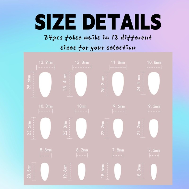 - 【False Nails Kit】The package includes 24 stick-on false nails (assorted in 12 different sizes), allowing you to create beautiful nail art for special events or everyday wear!
