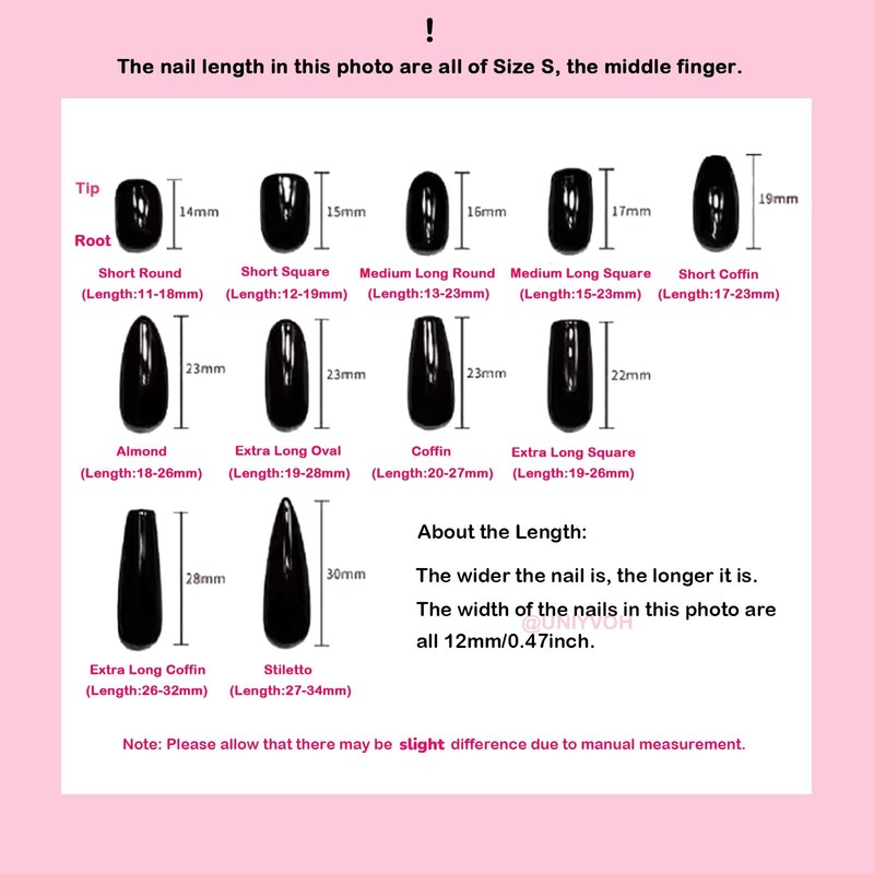 3.Please measure your nails size correctly before making an order. The “XS/S/M/L”selections on the page means “X-Small/Small/Medium/Large” sizes, NOT nails length. If you want to know how long the false nails are, please refer to the product photos which shows the size chart.