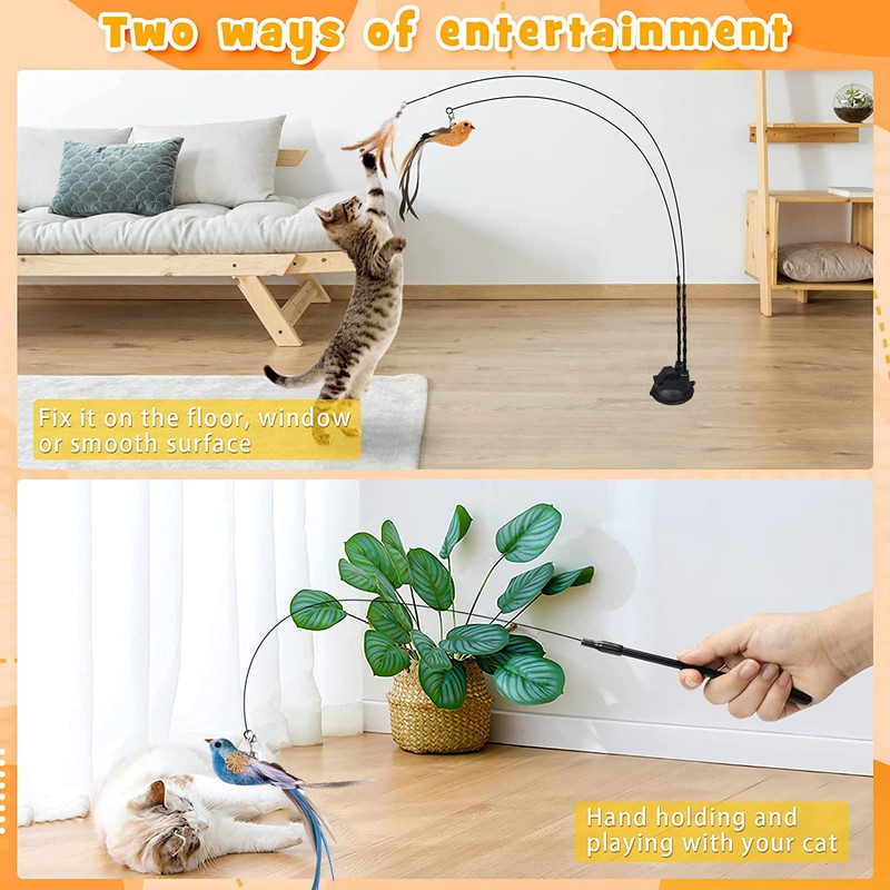 - 😸【3 in 1 Cat Toys Set】Package contains 1 suction cups, 2 cat wands, 2 bird toys, 3 worm toys, 1feather toys. All replacements are universal, they are durable and will keep your cat interested.