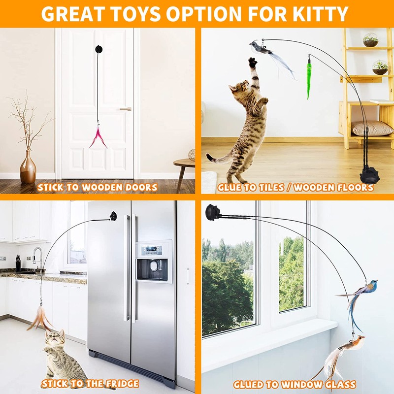- 😸【BEST CHOICE OF CAT TOYS】This cat toys unlocks two ways to tease cats: 1. You can hold the cat stick to interact with the cat; 2. When you are tired or busy, insert the cat stick into the suction cup , it is an automatic cat toys with a bell. It helps cats have fun exercise, exercise body and brain and burn excess energy.
