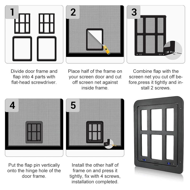- Easy to install: the dog flap medium dogs comes with screws and installation instructions. All you need is a knife (or scissors) and a screwdriver to easily assemble the door by attaching the outer frame and cover with the screws and nuts included.