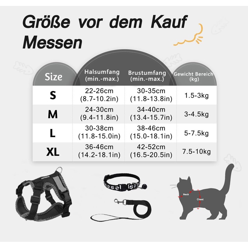 - SIZE OPTIONS Cat harness has S-XL 4 sizes to fit cats/dogs of different sizes. If you choose a well-fitting harness for your cat, we recommend you measure your cat's neck/chest circumference and refer to the size chart to choose the best size.
