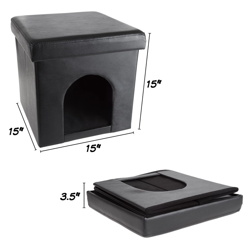 - PRODUCT DETAILS – Materials: PVC Faux Leather. Dimensions: (L) 15” (W) x 15” (H) x 15”; Folded: (H) 3.5”. Total Weight Capacity of Cat Cave Bed is 100lbs. Color: Black.