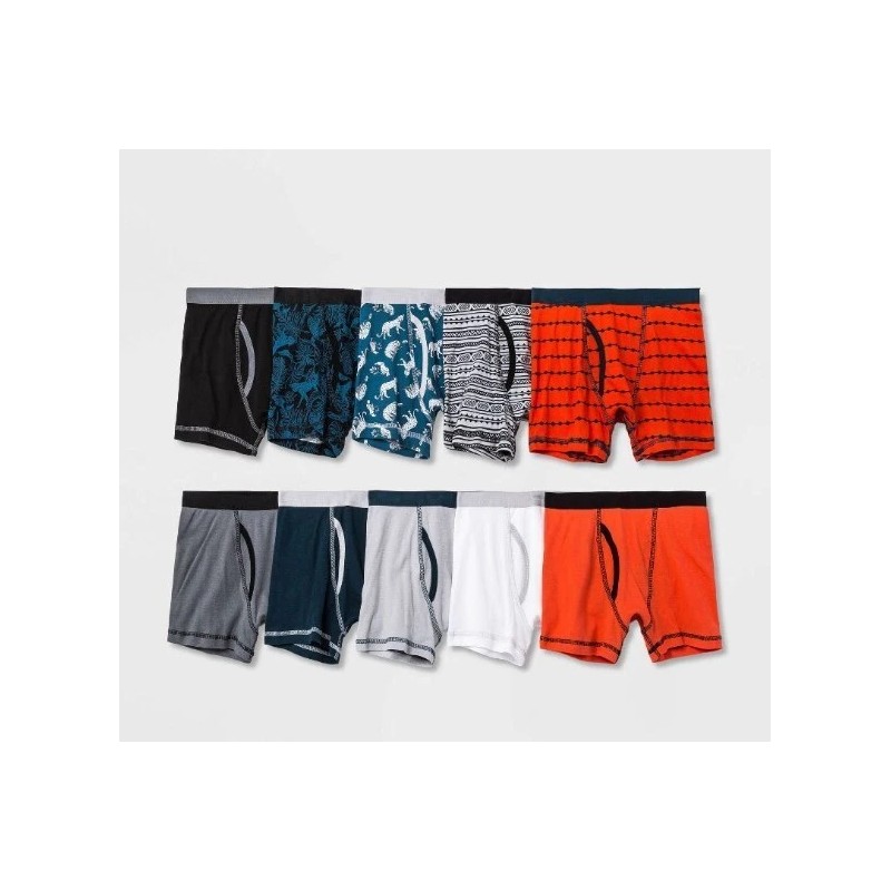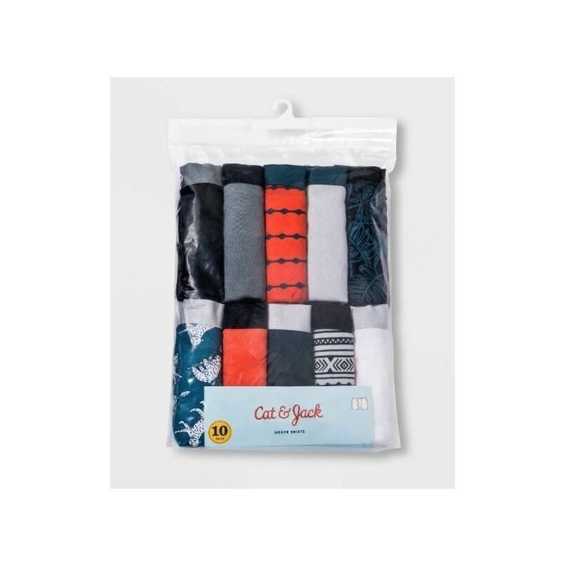 The product is a 10-pack of Cat & Jack boxer briefs for boys in size XS (4/5). The underwear features a jungle print theme with multiple designs in a multicolor palette. Perfect for young boys, this comfortable and stylish underwear set is a practical addition to their wardrobe.