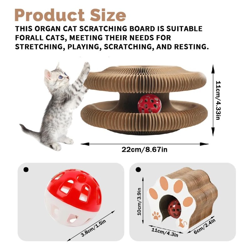 - 【Multifunctional Magic Organ Cat Scratching Board】A cat accordion board toy with a ball, magic organ cat scratcher with honeycomb encryption and thickening, tight gaps, sturdy and durable, and will not harm the paws. Cat scratching toy,the unique accordion design not only looks beautiful and elegant, but also allows cats to stretch and scratch freely while playing, satisfying their natural needs.