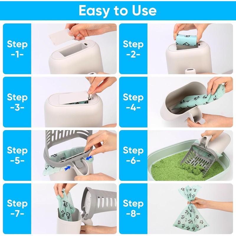 - 【120 Counts Litter Bags】The Cat Box Scooper includes 8 rolls of garbage bags, each roll has 15 garbage bags, a total of 120 count refill bags. Meet your cleaning needs.