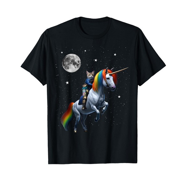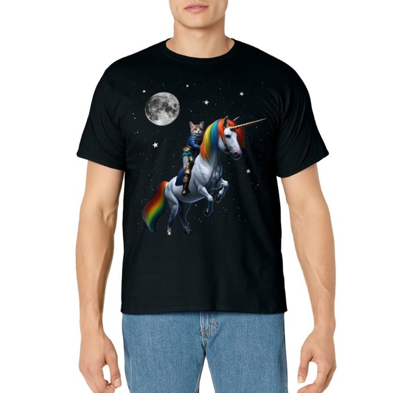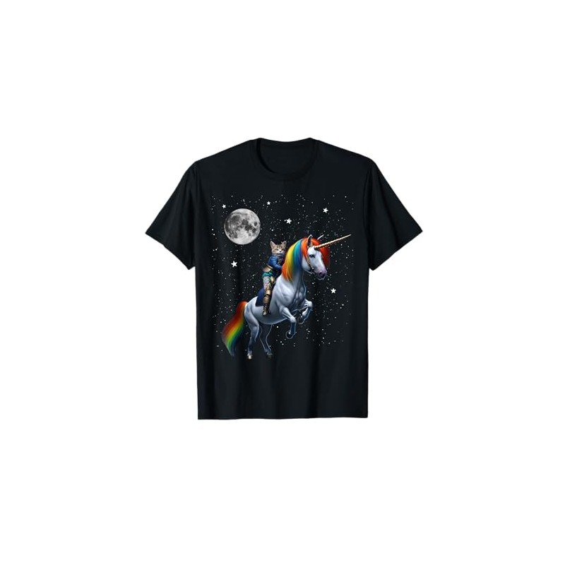 - This is an image printed on a product. It depicts a cat riding a unicorn, with the moon and stars in the background. The unicorn has a rainbow colored mane and tail