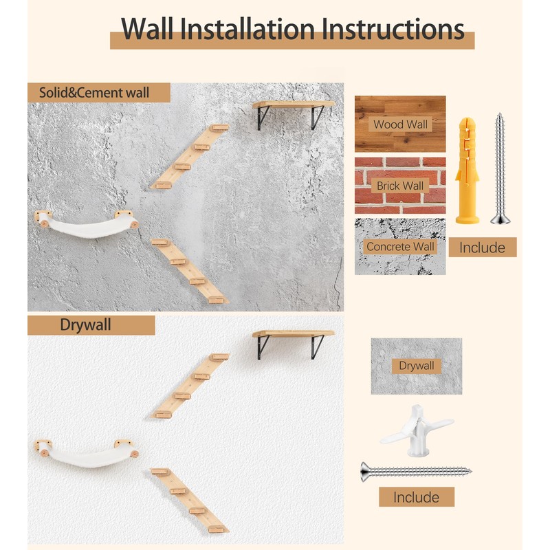 - Secure & Adjustable Cat Wall Ladders: Made from natural pine and wrapped with thick jute rope, the steps provide grip and scratching fun. Each ladder can be installed facing left or right, giving you flexible layout options on your wall.