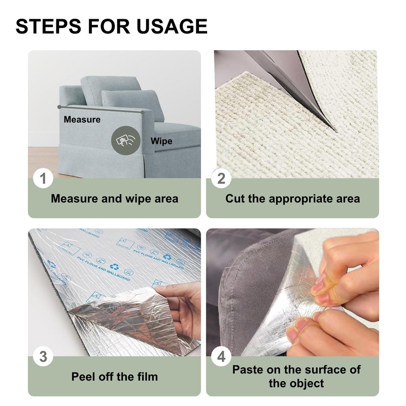 - [Easy to Use and Maintain]: Wipe and measure the pasting area first, (please do not use alcohol to wipe the surface, otherwise the product will lose its stickiness.) Cut out the required size, and then paste. Self-adhesive backing sticks easily to furniture. It is not easy to fall off even if it is scratched violently. Simply wipe or vacuum the cat hair off the mat when cleaning.
