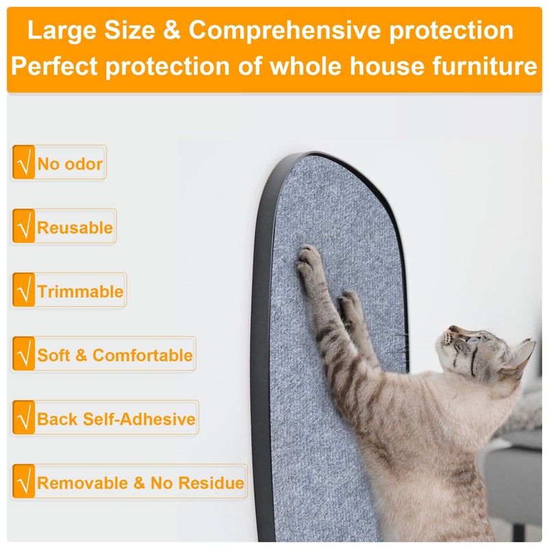 - Multifunctiona - You could stick it to a wall ,the side of your couch, a chair, a non-porous surface, a door, floor and wood stairs that your cat likes to scratch, cat shelves, cat tree and cat tower, etc. This scratch pad effectively prevents cats from scratching furniture, preventing scratches, or is an effective anti cat scratch pad.