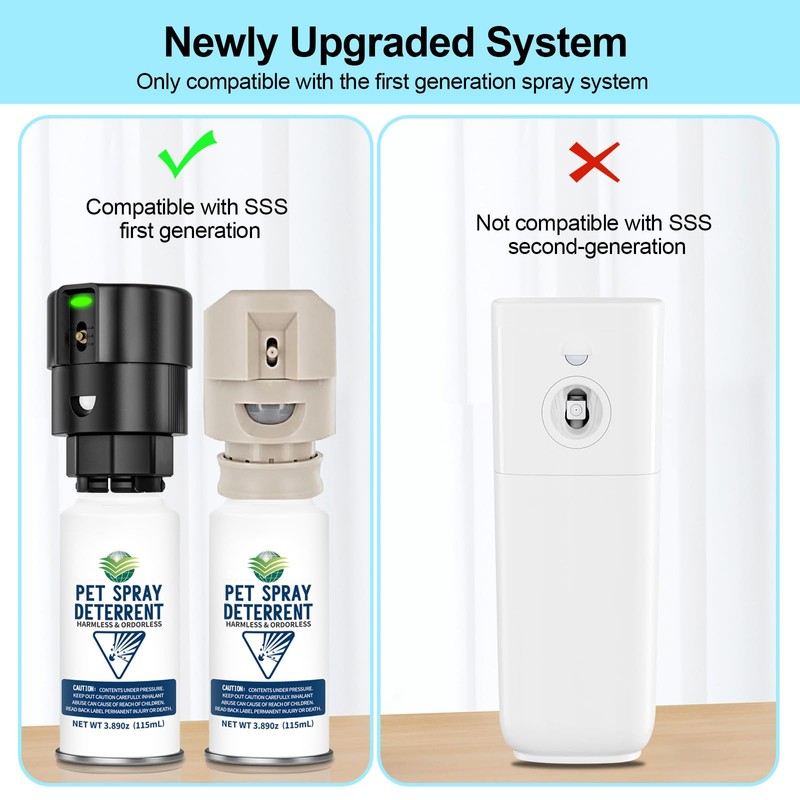- [Compatible Refill Cans] The spray deterrent cans apply to the first-generation Safe Pets CAT SSS spray deterrent system [incompatible with the second-generation system] it is suitable for cats and dogs of all sizes. Keep them away from problem areas with a motion detector air spray. doahzy spray refills for Cat Spray System safely help reduce pet-related damage in your home