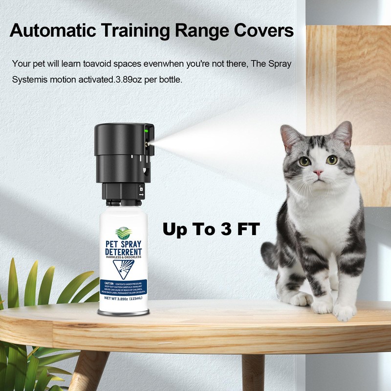 Use Pet System Cat Spray your pets away from prohibited areas in your home, such as countertops, sofas, coffee tables, trash cans, stairs, indoor plants, Christmas trees, and other places you want your pets to avoid. This Pets CAT SSS spray deterrent system will automatically sense pets 3 feet away and quickly release odorless spray to prevent them from entering the restricted area.