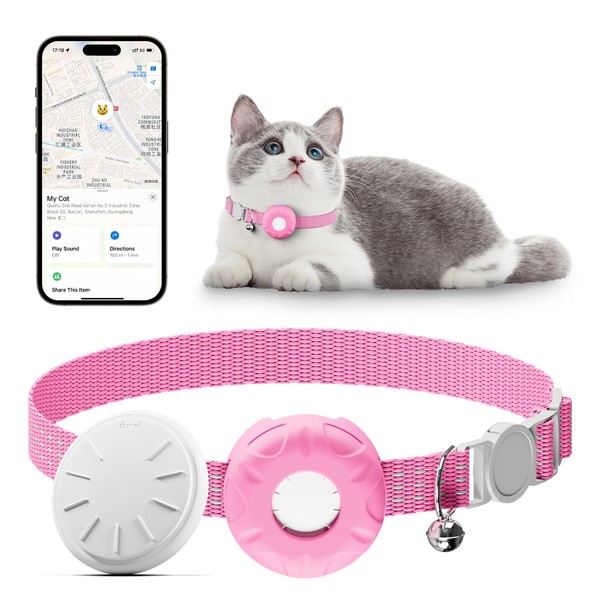 Cat Tracker, Waterproof Pet Tracker for Cats, Cat Tracker Collar with Safety Elastic Buckle,GPS Tracker Compatible with Apple Find My App (Only iOS), No Monthly Fee, Pink