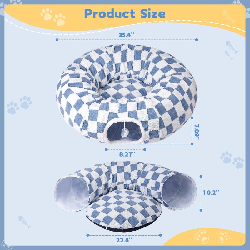 - Unique Cat Tunnel for Indoor Cats - Get into the virbant world with this unique cat tunnel bed. The blue or green and white color scheme is reminiscent of wondrous vast land of lakes and forests, making it the perfect addition to your kitty's decor. Adding some daily cheer to your kitty's space.