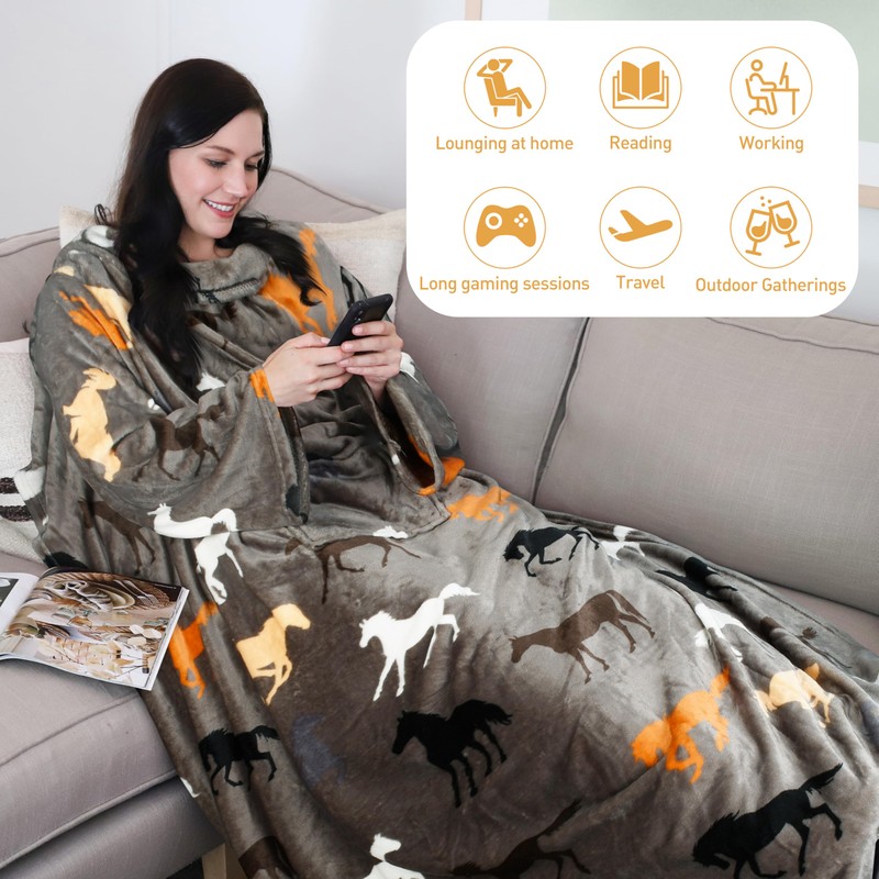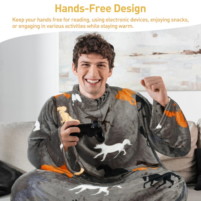 Catalonia Taupe Horse Wearable Blanket with Sleeves and Pocket, Soft Comfy Fleece Snuggy Wrap Throws Blanket Robe for Women and Men