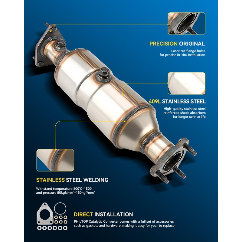 • Perfect Direct Fit: This catalytic converter's direct-fit design facilitates bolt-on installation, streamlining the assembly process. PHILTOP uses cutting-edge 3D scanning technology throughout the research and development phase to ensure that the replacement converter will fit and function exactly like the original equipment. Offerings include gaskets and/or the required fitting tools.