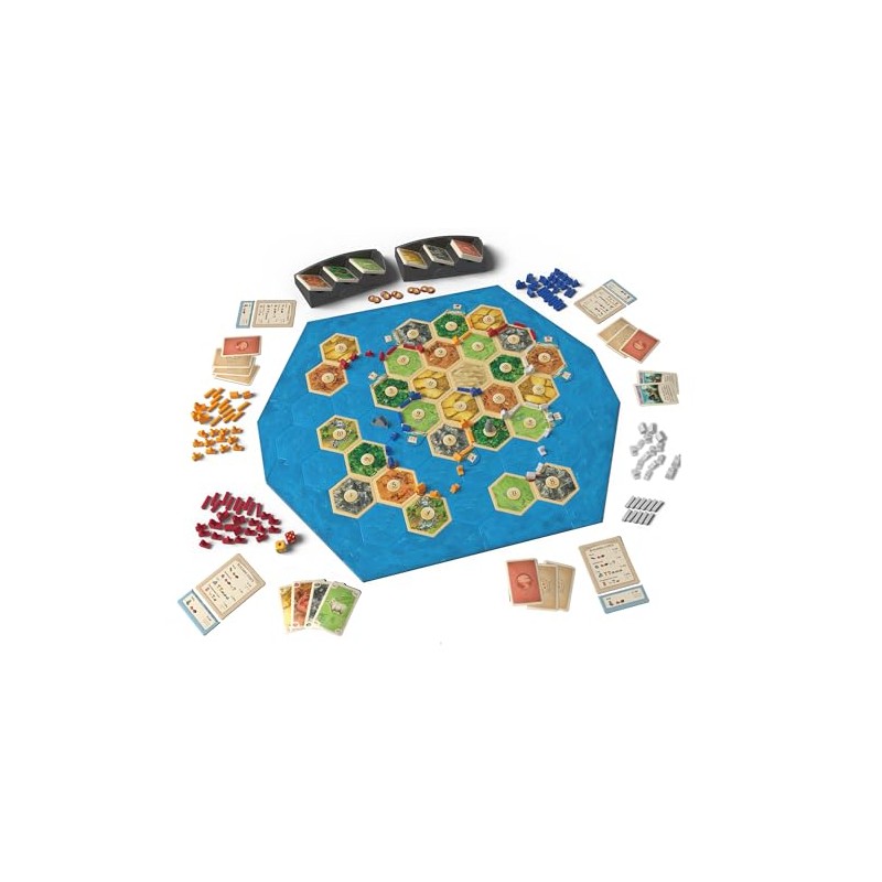 In Catan: Seafarers you control a group of bold seafaring settlers exploring and taming the wild, uncharted Isles of Catan. Each game brings you to new seas and new lands. You might even discover the precious Gold fields (a very valuable new terrain). Every game is unique and full of fun! Embark on an epic quest to settle the Home island, build ships, and chart nearby waters. Guide your brave seafarers to victory through cunning trades and wise development. Be first to create new sea lanes and settle the newly- discovered isles. The best strategy and a nice dash of luck decide who will be the undisputed ruler of the rich Isles of Catan! Capture the adventure of seafaring, exploration, and trade. Catan: Seafarers is a 3-4 player expansion for the best-selling Catan board game. Share some fun at sea! Components 60 Wooden Ships 1 Pirate Ship 6 Frame Pieces 19 Sea Hexes 11 Hexagonal Region Tiles 50 Catan Chits 10 Number Tokens 10 Harbor Tokens 1 Rulebook and Scenarios.