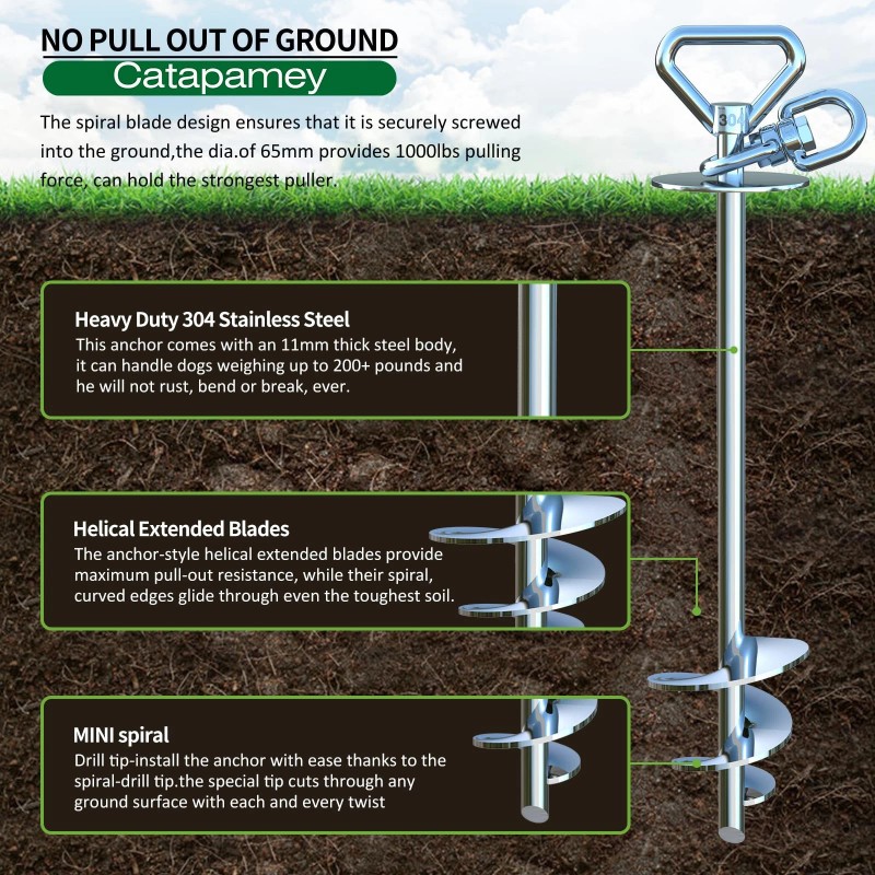 Easy to install- dog stake for yard Adopting a spiral drill bit and curved double blade design,with a comfortable soft grip stainless steel rod,you only need to easily rotate a few times.The sharp and curved dual blades allow you to slide on any surface for smooth and seamless installation.Including sandy,clay,and even rock