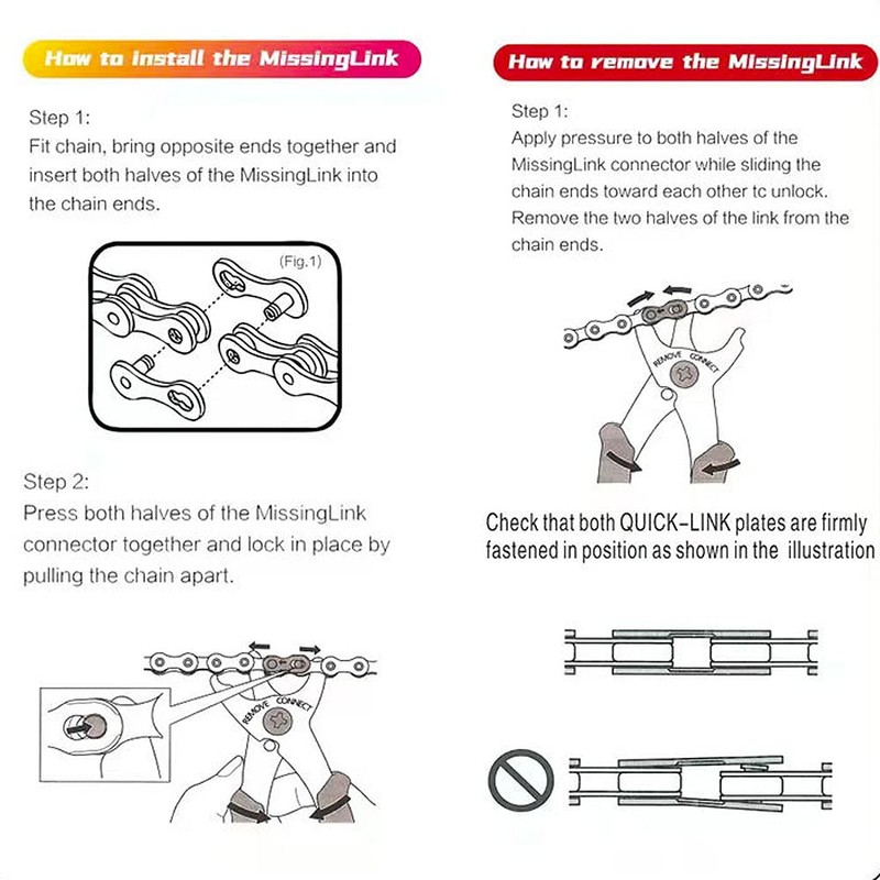 - This chain comes with a pair of missing links, which can be installed simply and quickly without tools.