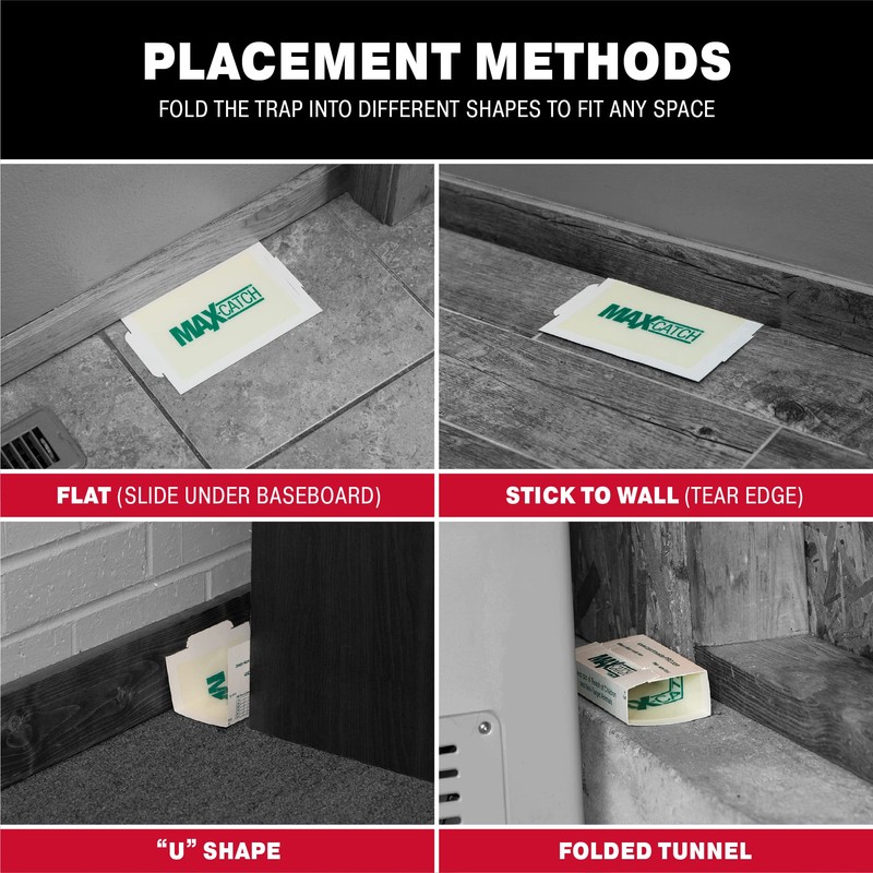 - READY TO USE: Max-Catch Glue Traps are pre-scented and intended for use without additional bait. For best use, leave trap with paper on so pests can acclimate to the trap, then place glue boards along known or suspected rodent pathways. The traps are scented to attract insects, ants, mice, rats, roaches, spiders, crickets and other pests and rodents.