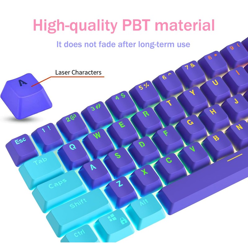 - 【High Quality PBT Material】Double hit injection molding technology provides never-fading fonts, good touch texture, durable material won't leave grease and sweat stains. More suitable for high intensity gaming and long time typing, no more need to wipe with wet wipes.