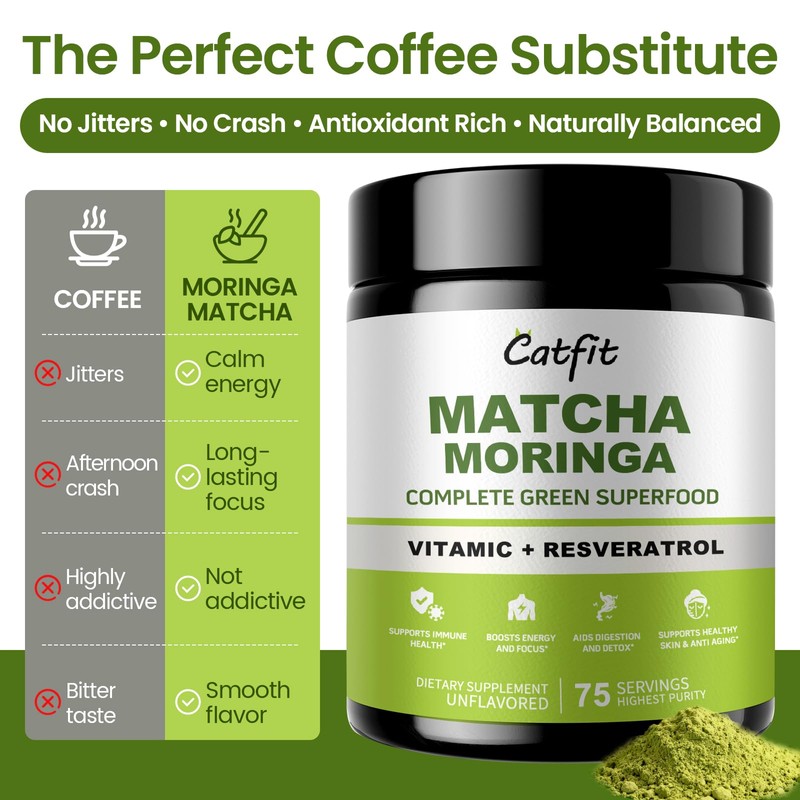 - Powerful Superfood Blend C Catfit moringa powder contains 1,655mg matcha powder, 1,200mg moringa leaf powder, green tea powder & resveratrol per serving. This formula provides comprehensive health support, including energy enhancement, antioxidant protection, and immune system strengthening