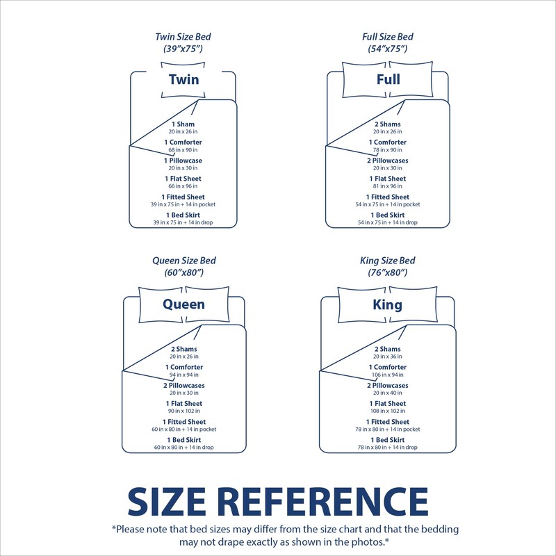 - WHAT’S INCLUDED - Queen Set: One Comforter (86"x86"), Two Standard Shams (20"x26"+2" flange), One Bed Skirt (60"x80"+14" drop), One White Fitted Sheet (60"x80"+14" pocket), One White Flat Sheet (90"x102") and Two White Pillowcases (20"x30")