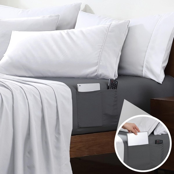 - IRRESISTIBLE BEDDING - Clear the clutter on top of your bed in minutes with the smart pocket fitted sheet. With organizer pockets on both sides, items are only within an arm's reach. This fitted sheet, made of 100% double brushed microfiber, is amazingly soft and will enhance your bedroom styling.