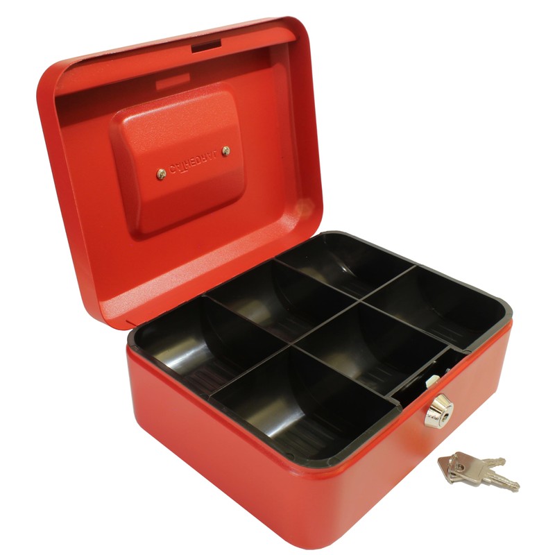 Cathedral Products Key Lockable Cash Box with Lift Out 6 Compartment Coin Tray - 8 Inch - Red