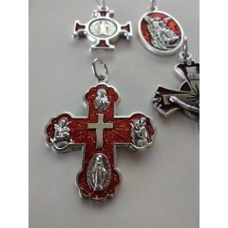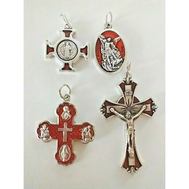 Catholic Lot Medals Red Enamel St Benedict Michael Four Way Cross Crucifix