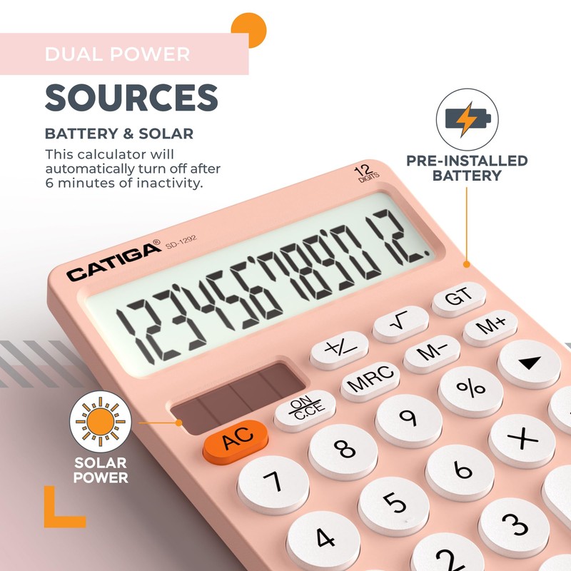 CATIGA 12 Digit Desktop Calculator with Large LCD Display, 4 Funtions Calculator, Round Design Big Button, Solar and Battery Dual Power, Standard Function for Office, Home, School, SD-1292