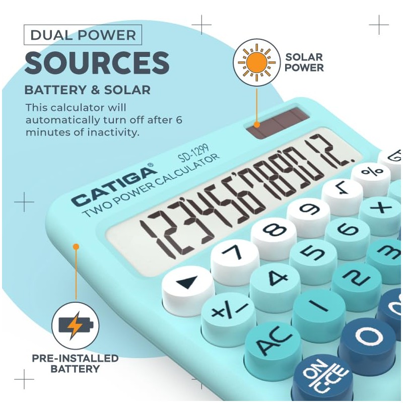- Dual Power for Long Battery Life: Operates with both solar and battery power for continuous use, featuring an auto power-off function that activates after 6 minutes of inactivity to extend battery life. Compact, lightweight, and powered by a single AAA battery (included), this calculator is perfect for quick calculations at home, school, or the office.