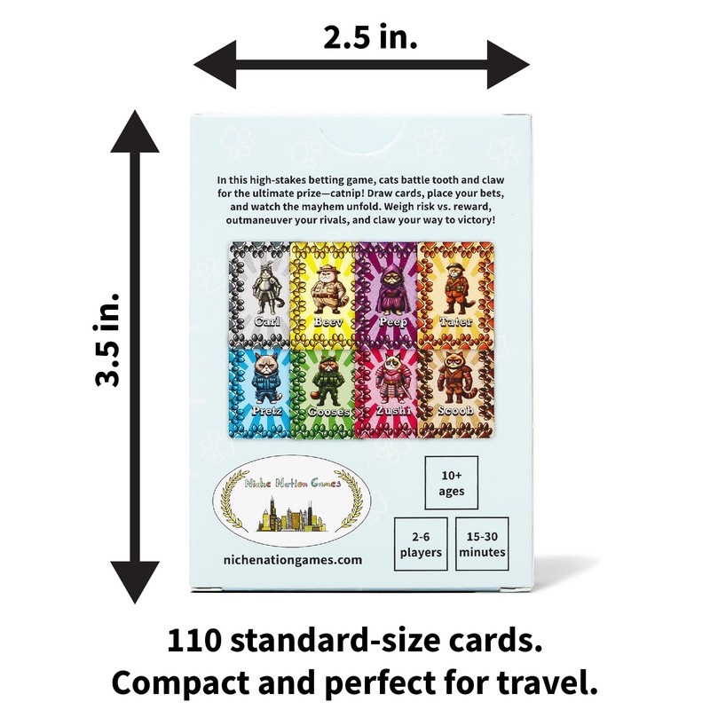 - STRATEGIC BETTING GAME: Up to 6 players place their bets on eight quirky, battle-ready cats in an unpredictable race for the most catnip. It’s clever, chaotic, and guaranteed to keep everyone entertained!