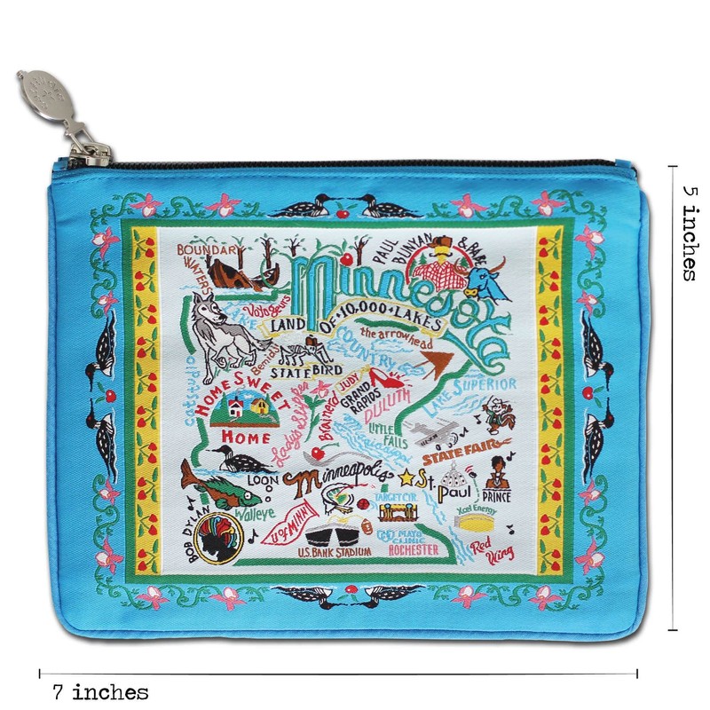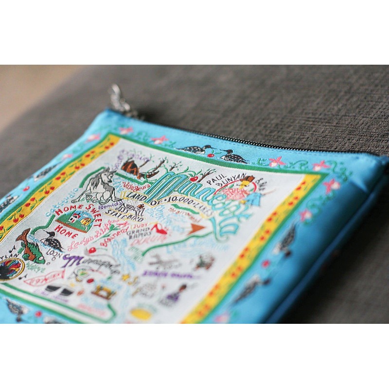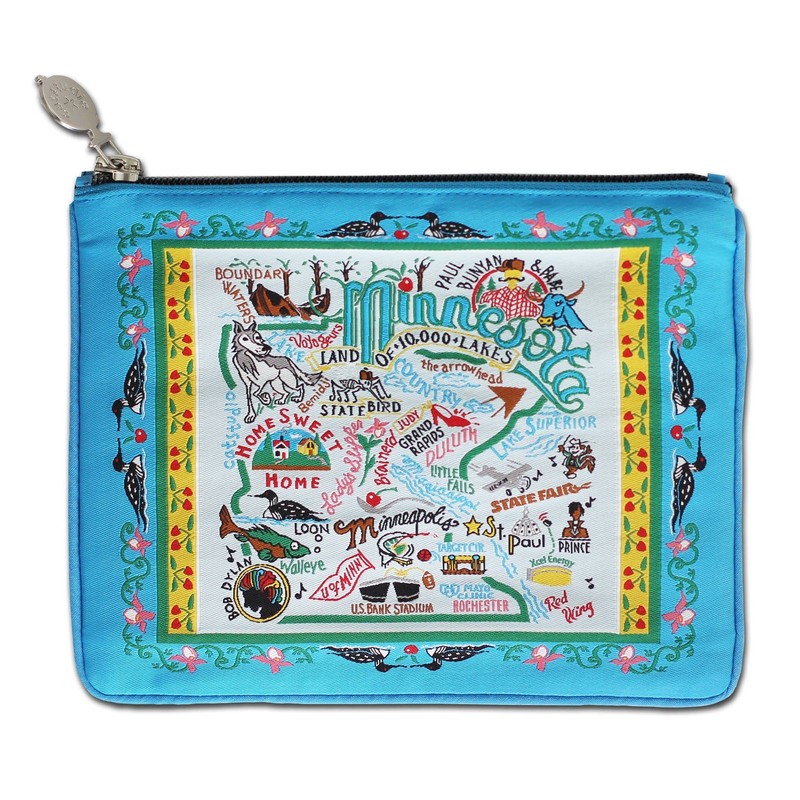 This design is "Land of 10,000 Lakes!" This original design celebrates the State of Minnesota - from Rochester (not New York) to Little Falls to International Falls...lots of water up there!!! What a beautiful state!!! Our original design is uniquely woven (not printed!) into a handy-sized zip pouch - perfect for toting your keys, cash & credit cards, cosmetics - all your small necessities! Complete with chic zipper and pull, and our signature Geo black lining. Conveniently sized at 5x7 inches. Geography Pouches The stylish and functional catstudio zip pouch is the perfect way to CARRY YOUR PRIDE wherever life takes you, and has proven to be more useful than a Swiss Army knife!