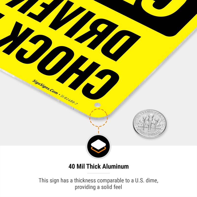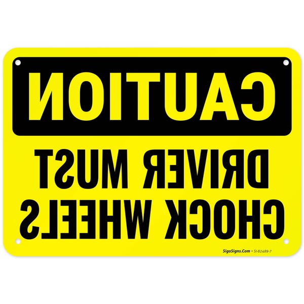 Caution Driver Must Chock Wheels Rear View Mirror Sign, 10x7 Inches, 55 mil thick HDPS (high density polystyrene), Made in USA by Sigo Signs